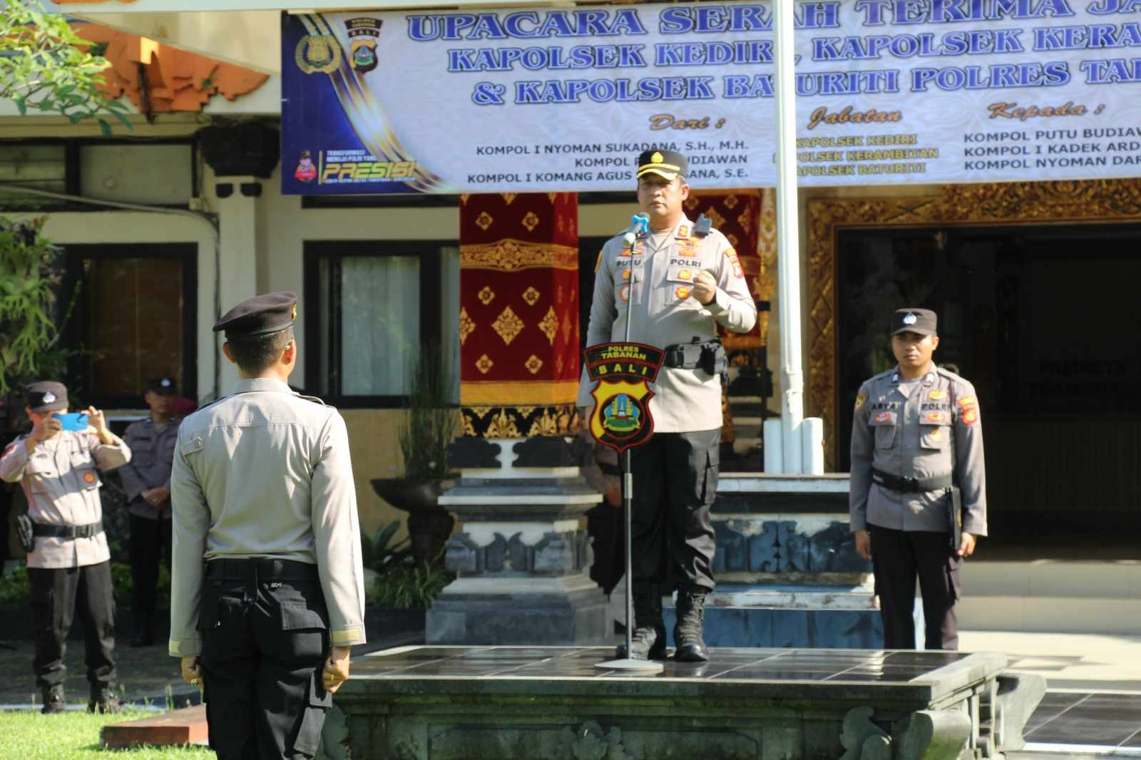 FOTO : Polres Tabanan menggelar Upacara Serah Terima Jabatan (Sertijab) Kapolsek Kediri, Kapolsek Kerambitan, dan Kapolsek Baturiti, Sabtu (24/1/2026) pagi.