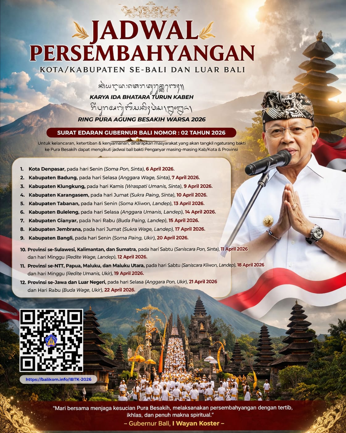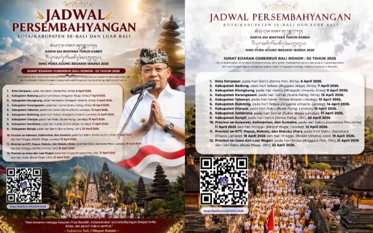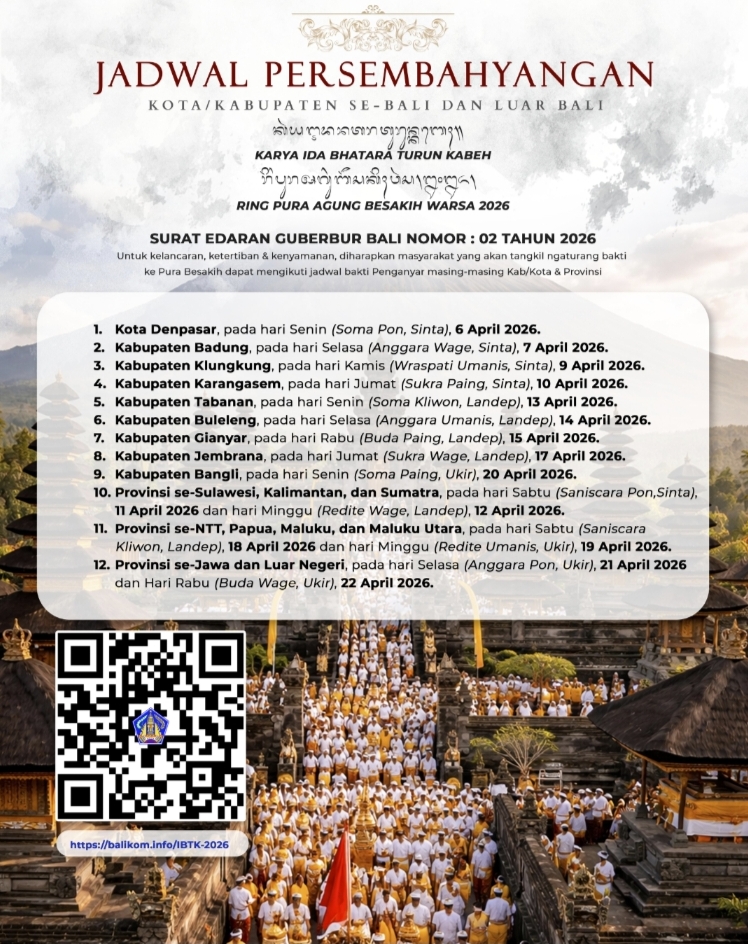 DENPASAR, Breaking-news.co.id | Pemerintah Provinsi Bali resmi menerbitkan Surat Edaran Gubernur Bali Nomor 02 Tahun 2026 terkait pengaturan jadwal persembahyangan dalam rangka Karya Ida Bhatara Turun Kabeh (IBTK) Warsa 2026 di Pura Agung Besakih.