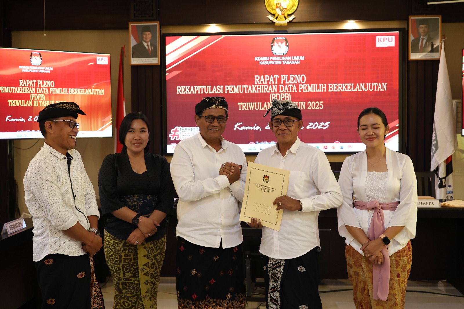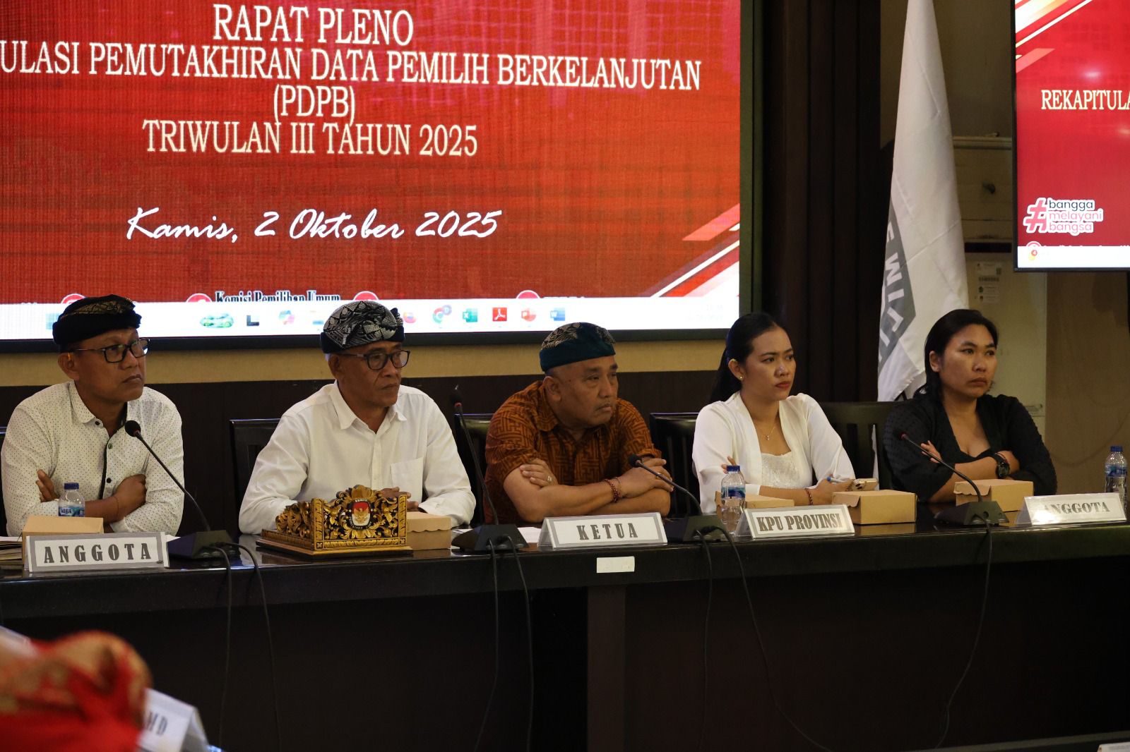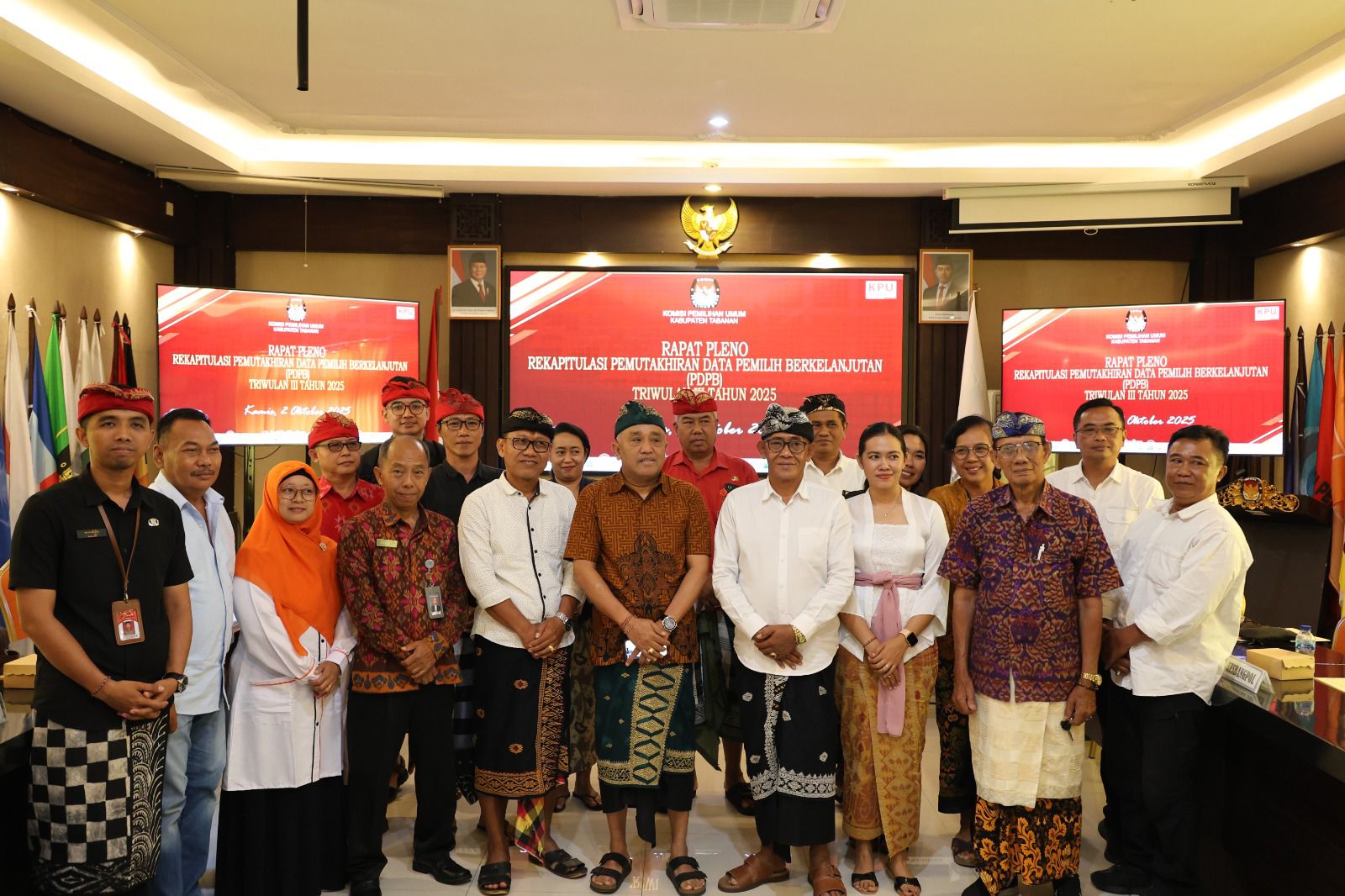 TABANAN, Breaking-news.co.id | Badan Pengawas Pemilu (Bawaslu) Kabupaten Tabanan menghadiri Rapat Pleno Rekapitulasi Daftar Pemilih Berkelanjutan (PDPB) Triwulan III Tahun 2025, yang digelar Komisi Pemilihan Umum (KPU) Kabupaten Tabanan, melalui Rapat Pleno yang dipimpin langsung oleh Ketua KPU Tabanan, I Wayan Suwitra, pada Kamis (2/10/2025).