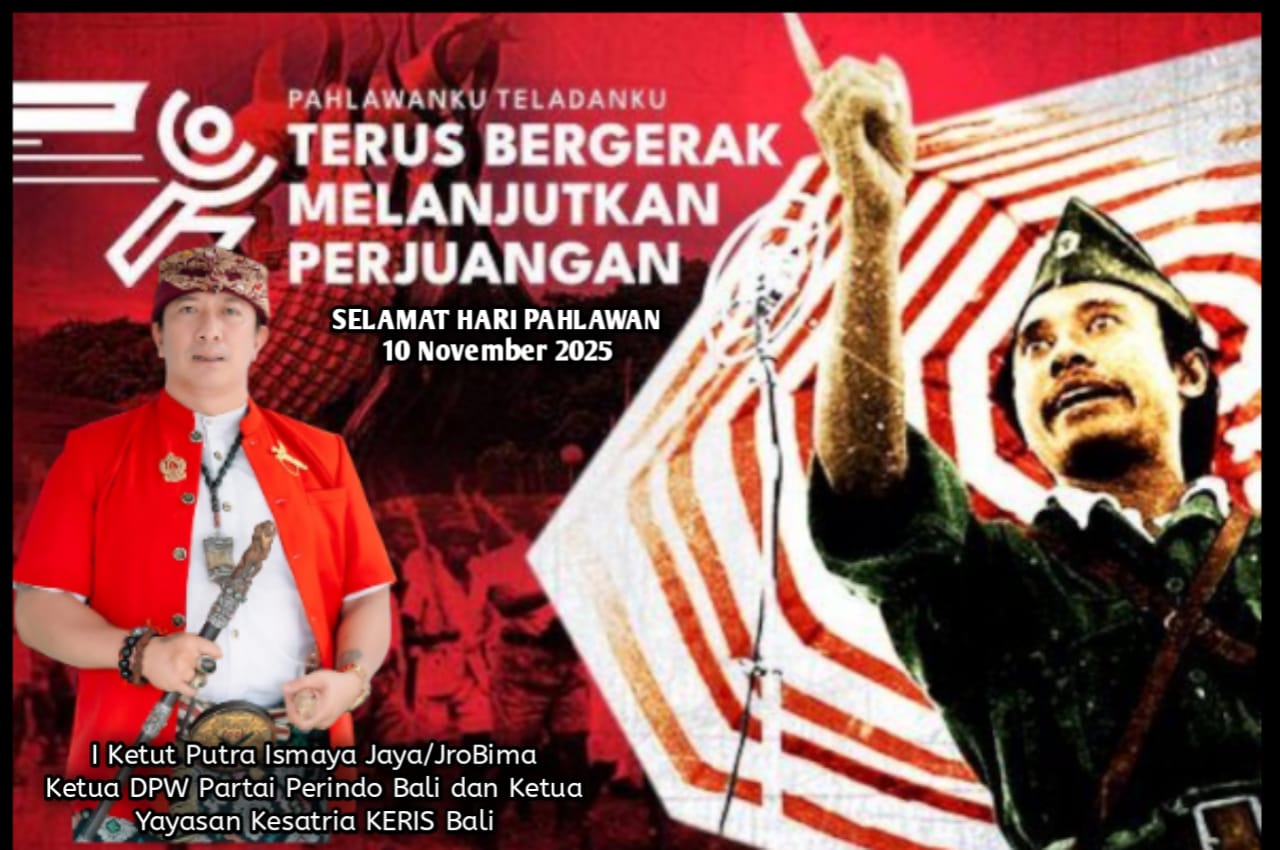 DENPASAR, Breaking-news.co.id | Dalam rangka memperingati Hari Pahlawan yang jatuh setiap tanggal 10 November, Ketua Dewan Pimpinan Wilayah (DPW) Partai Perindo Bali sekaligus Ketua Yayasan Kesatria Keris Bali, Ketut Putra Ismaya Jaya alias Jro Bima, menyerukan pesan mendalam kepada seluruh masyarakat Bali dan Indonesia.